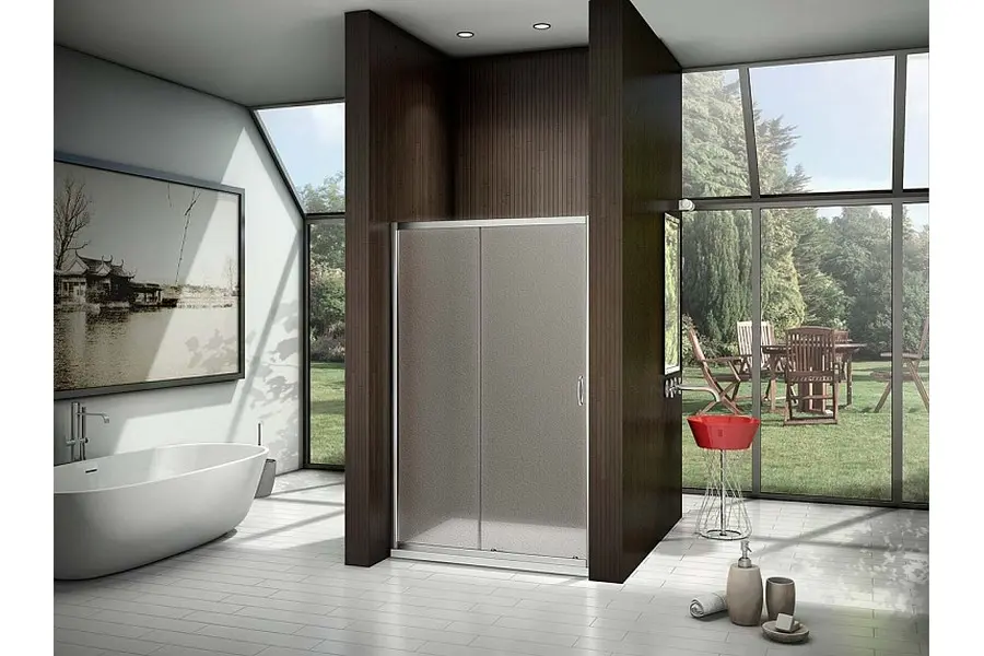 Душевая дверь Bas Latte обладает размером 140х185 см. Конструкция состоит из двух секций: одной неподвижной и одной раздвижной. Устанавливается в облицованный кафелем угол или нишу ванной комнаты на поддон или непосредственно на пол со встроенным душевым каналом или трапом