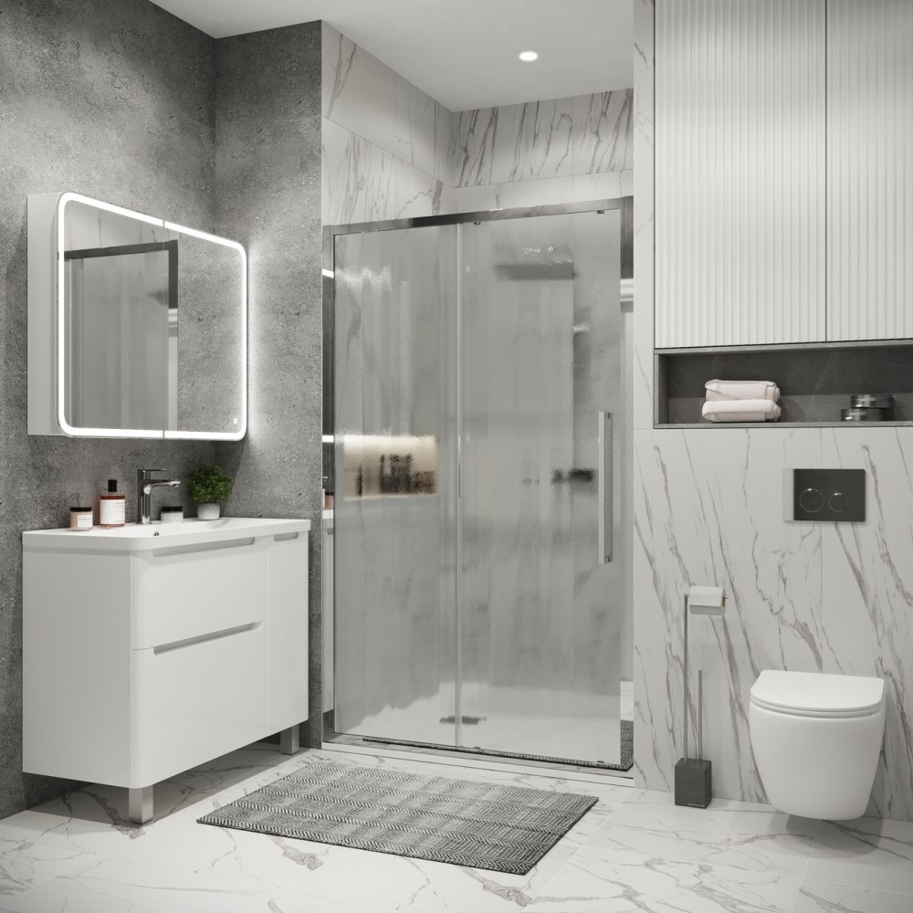 Душевая дверь Grossman Cosmo имеет размер 110х195 см. Прямоугольная форма, цвет профиля — хром, исполнение полотна двери — рифленое. Конструкция состоит из 2 секций. Раздвижной механизм открывания. Устанавливается в облицованный кафелем угол или нишу ванной.