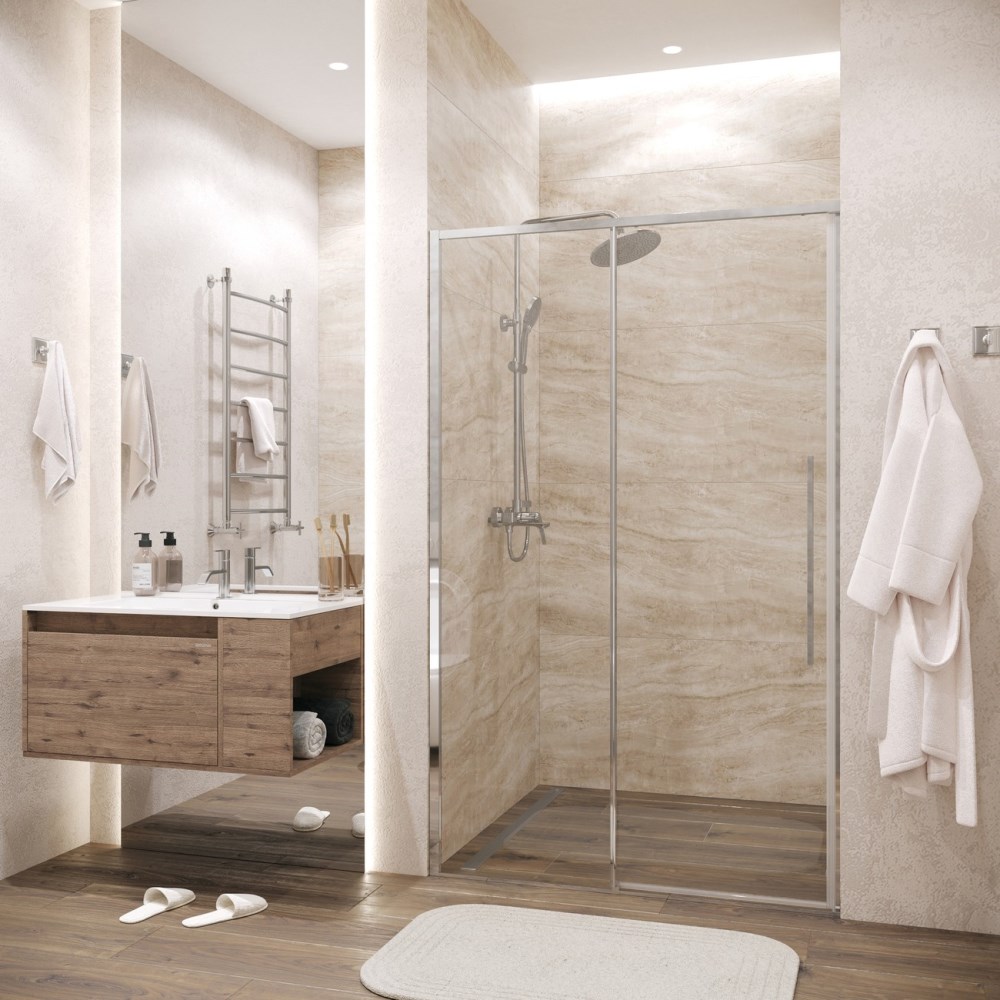 Душевая дверь Grossman Galaxy имеет размер 130х195 см. Прямоугольная форма, цвет профиля — хром, исполнение полотна двери — прозрачное. Конструкция состоит из 2 секций. Раздвижной механизм открывания. Устанавливается в облицованный кафелем угол или нишу ванной.