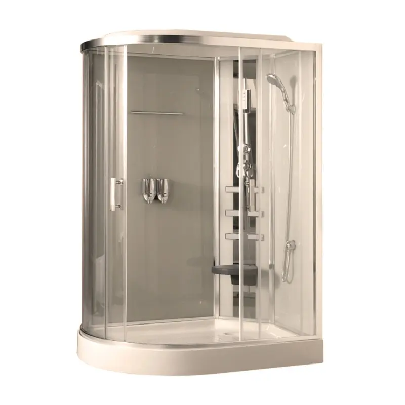 Душевая кабина Comforty 100 имеет размер 120х85 см. Форма — асимметричную, цвет хром, полотно прозрачное. Задняя панель слоновая кость. низкий поддон.