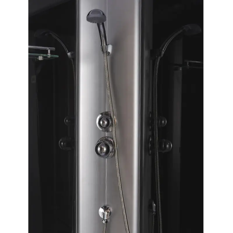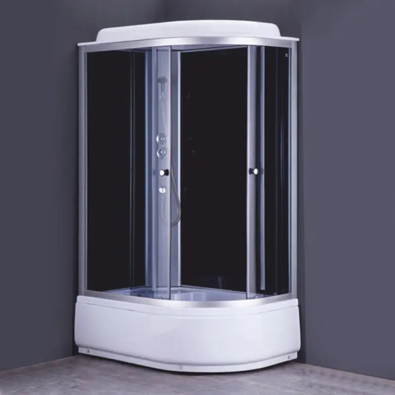 Душевая кабина Comforty 302 имеет размер 120х80 см. Форма — асимметричную, цвет хром, полотно тонированное. Комплектация: две раздвижные створки и магнитным профилем, двухрежимный смеситель, верхний душ, ручной душ, двойные ролики сверху и снизу, сифон с донным клапаном. Высокий поддон.