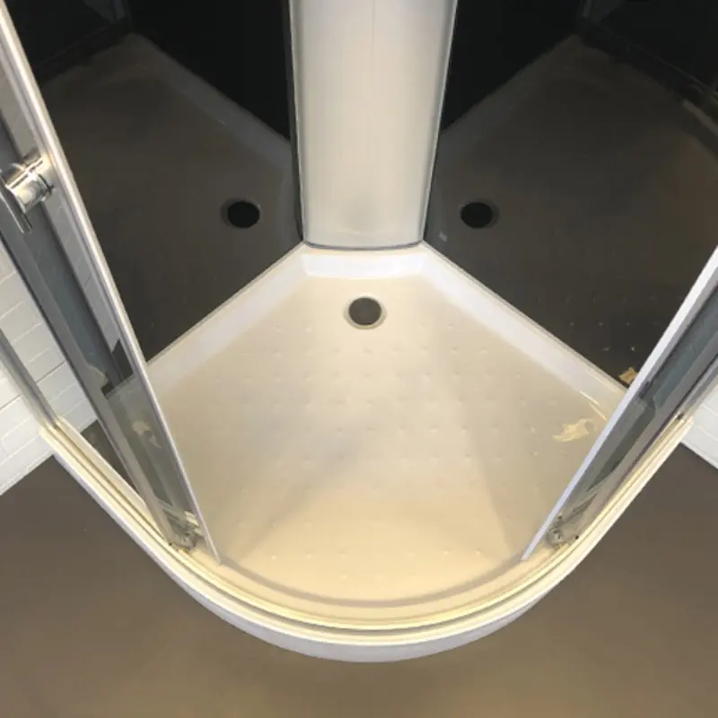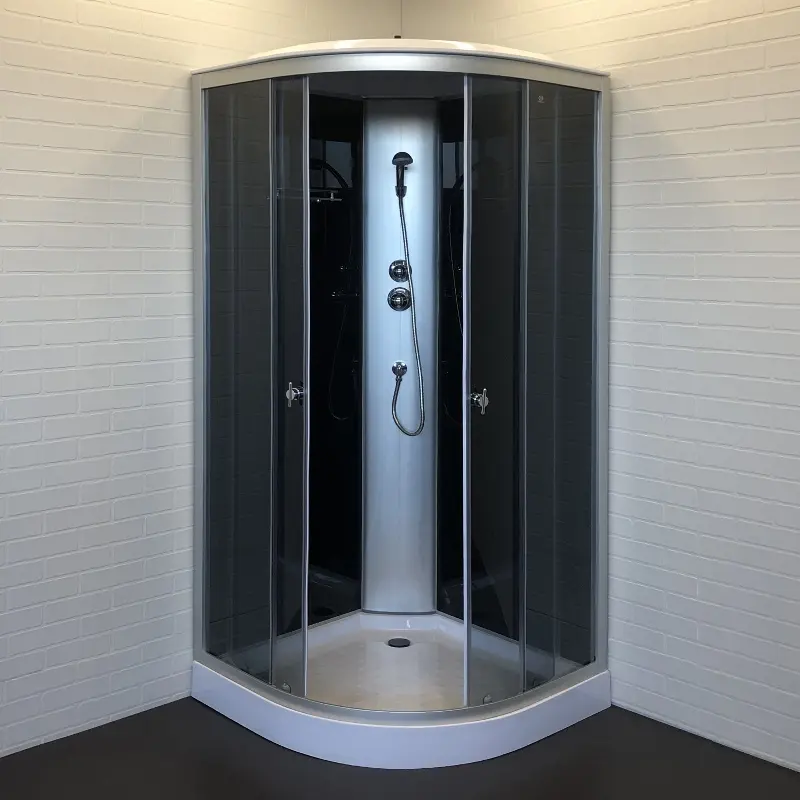 Душевая кабина Comforty 304 имеет размер 90х90 см. Форма — четверть круга, цвет хром, полотно тонированное. Комплектация: две раздвижные створки и магнитным профилем, двухрежимный смеситель, верхний душ, ручной душ, двойные ролики сверху и снизу, сифон с донным клапаном. Низкий поддон.