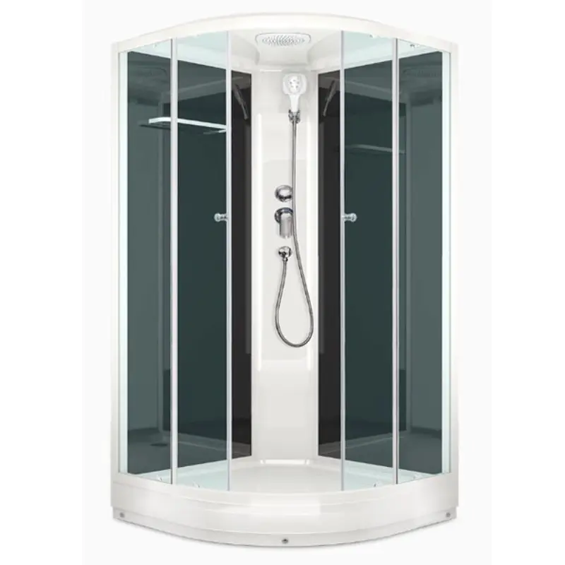 Душевая кабина Domani-Spa Delight Slim имеет размеры 900х900х2180 см. Форма — четверть круга, цвет белый, исполнение полотна двери прозрачное. Механизм открывания раздвижной. Поддон низкий и стеклянная черная задняя панель.
