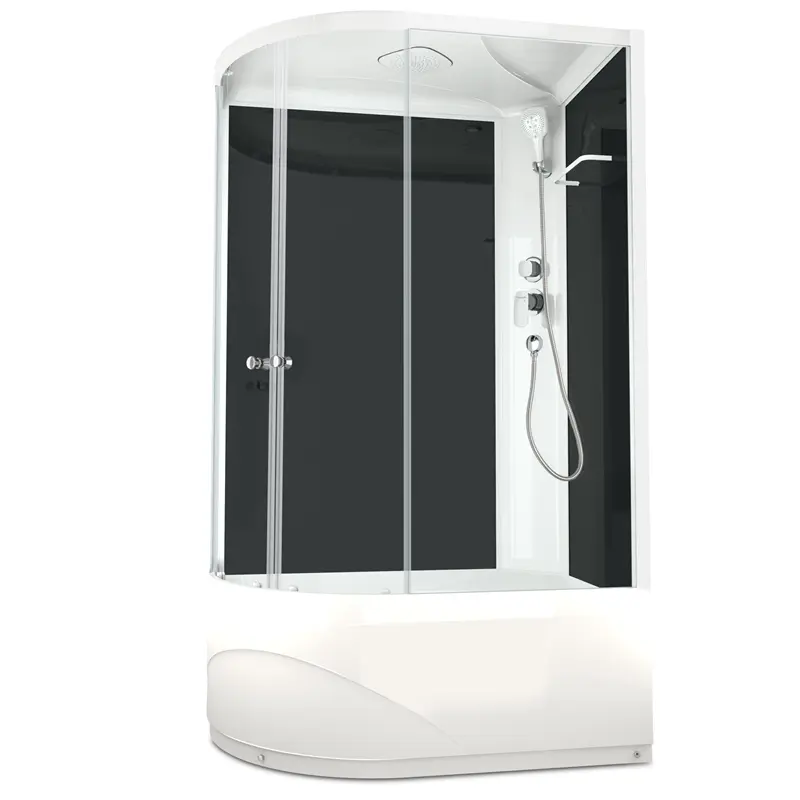 Душевая кабина Domani-Spa Delight Slim high имеет размеры 120х80х218 см. Форма — асимметричная, цвет белый, исполнение полотна двери прозрачное. Механизм открывания раздвижной. Поддон высокий и стеклянная черная задняя панель.