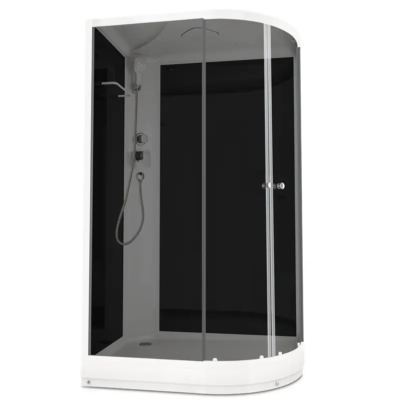 Душевая кабина Domani-Spa Delight Slim имеет размеры 120х80х218 см. Форма — асимметричная, цвет белый, исполнение полотна двери тонированное. Механизм открывания раздвижной. Поддон низкий и стеклянная черная задняя панель.