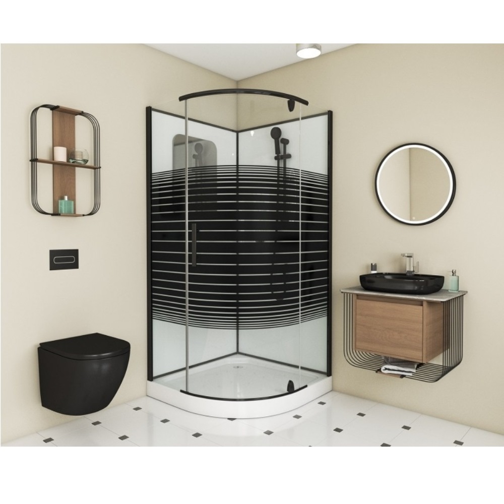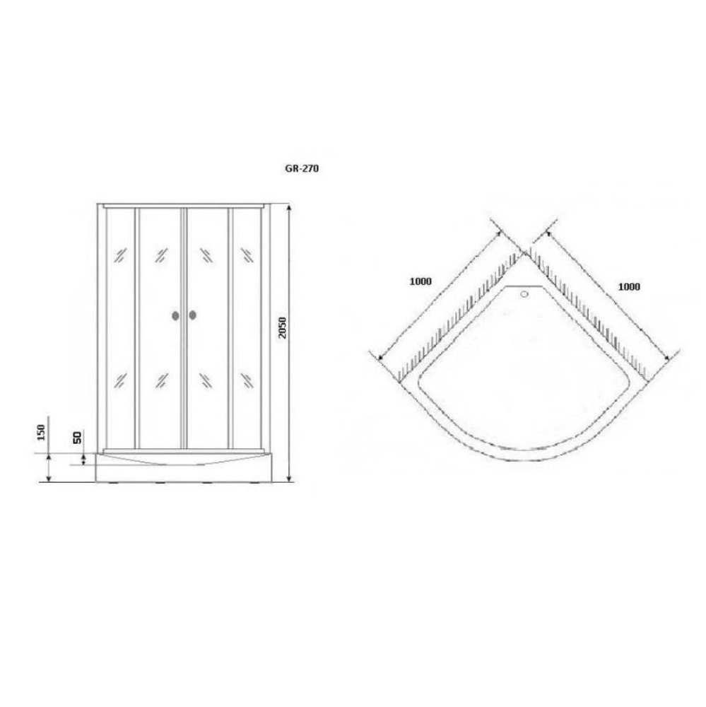 Душевая кабина Grossman Classic имеет размеры 100х100х205 см. Форма -четверть круга, цвет черный, исполнение полотна двери с узором. Механизм открывания раздвижной. Поддон низкий.