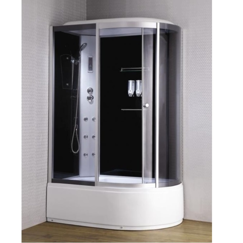 Душевая кабина Loranto Cs-00 имеет размеры 120х85 см. Форма — асимметричная, профиль черный, исполнение полотна двери тонированное. Высокий поддон.