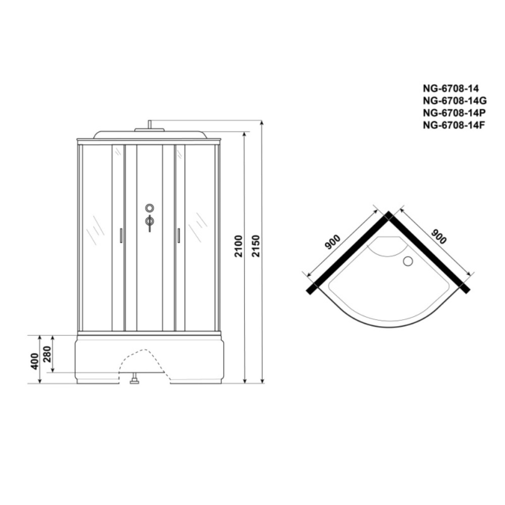 Душевая кабина Niagara Classic имеет размеры 90х90х215 см. Форма — четверть круга, цвет черный, исполнение полотна двери прозрачное. Механизм открывания раздвижной. Поддон высокий.