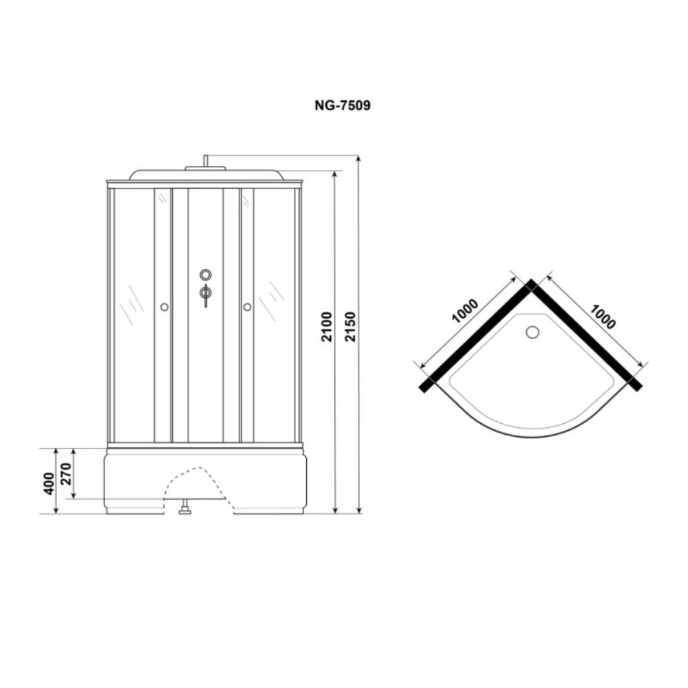 Душевая кабина Niagara Eco имеет размеры 100х100х215 см. Форма — четверть круга, цвет хром, исполнение полотна двери с узором. Механизм открывания раздвижной. Поддон высокий.