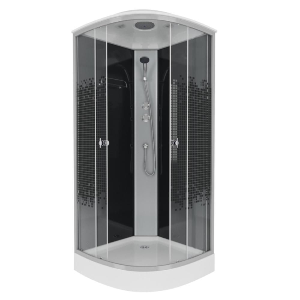 Душевая кабина Niagara Eco имеет размеры 80х80х215 см. Форма — четверть круга, цвет хром, исполнение полотна двери с узором. Механизм открывания раздвижной. Поддон низкий.