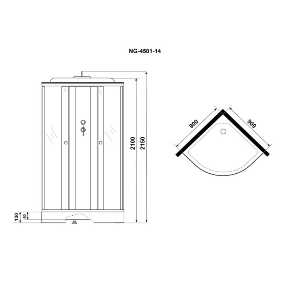 Душевая кабина Niagara Eco имеет размеры 90х90х215 см. Форма — четверть круга, цвет хром, исполнение полотна двери с узором. Механизм открывания раздвижной. Поддон низкий.