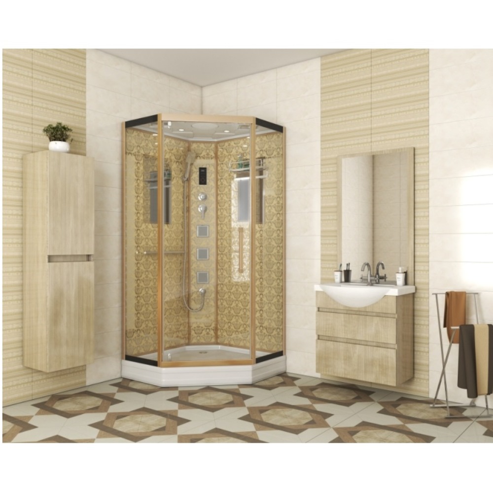 Душевая кабина Niagara Luxe имеет размеры 100х100х220 см. Форма — пятиугольная, цвет золото, исполнение полотна двери прозрачное. Механизм открывания раздвижной. Поддон низкий.