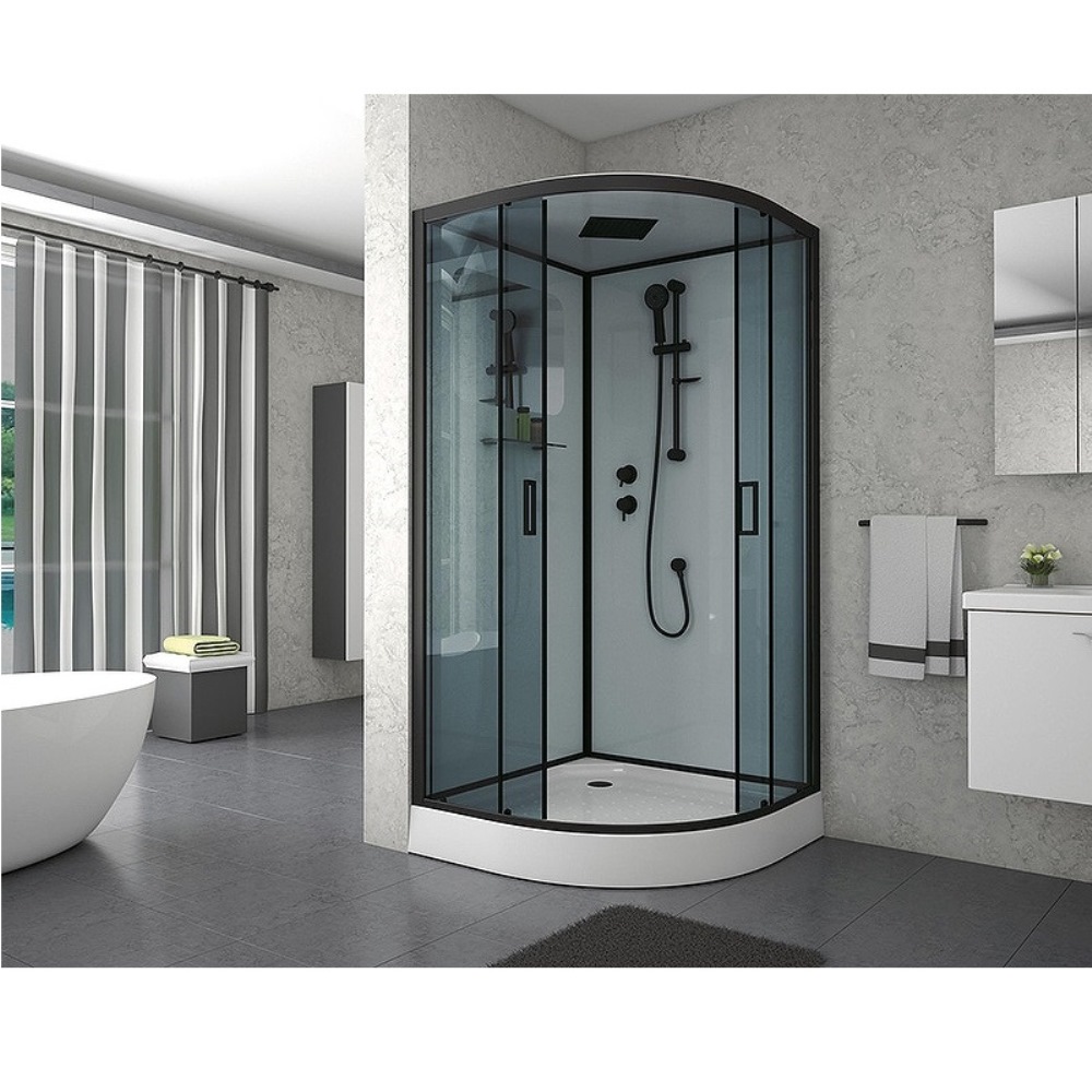 Душевая кабина Niagara Premium имеет размеры 100х100х210 см. Форма — четверть круга, цвет черный, исполнение полотна двери тонированное. Механизм открывания раздвижной. Поддон низкий.