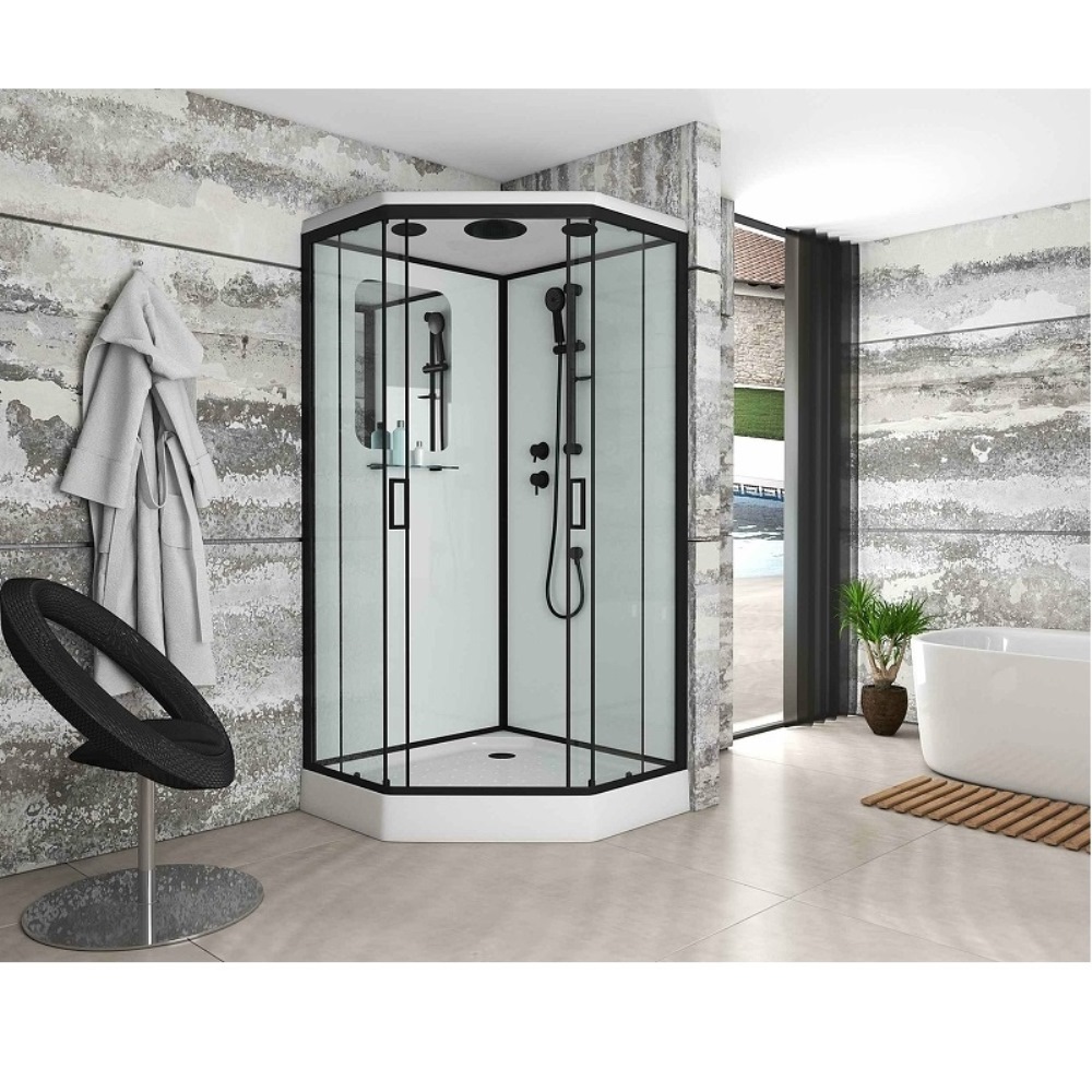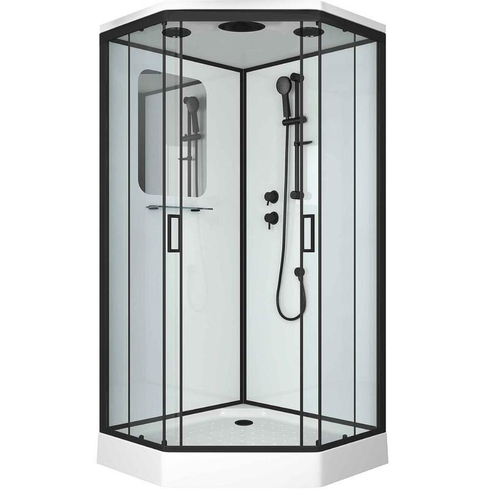 Душевая кабина Niagara Premium имеет размеры 100х100х220 см. Форма — пятиугольная, цвет черный, исполнение полотна двери тонированное. Механизм открывания раздвижной. Поддон низкий.