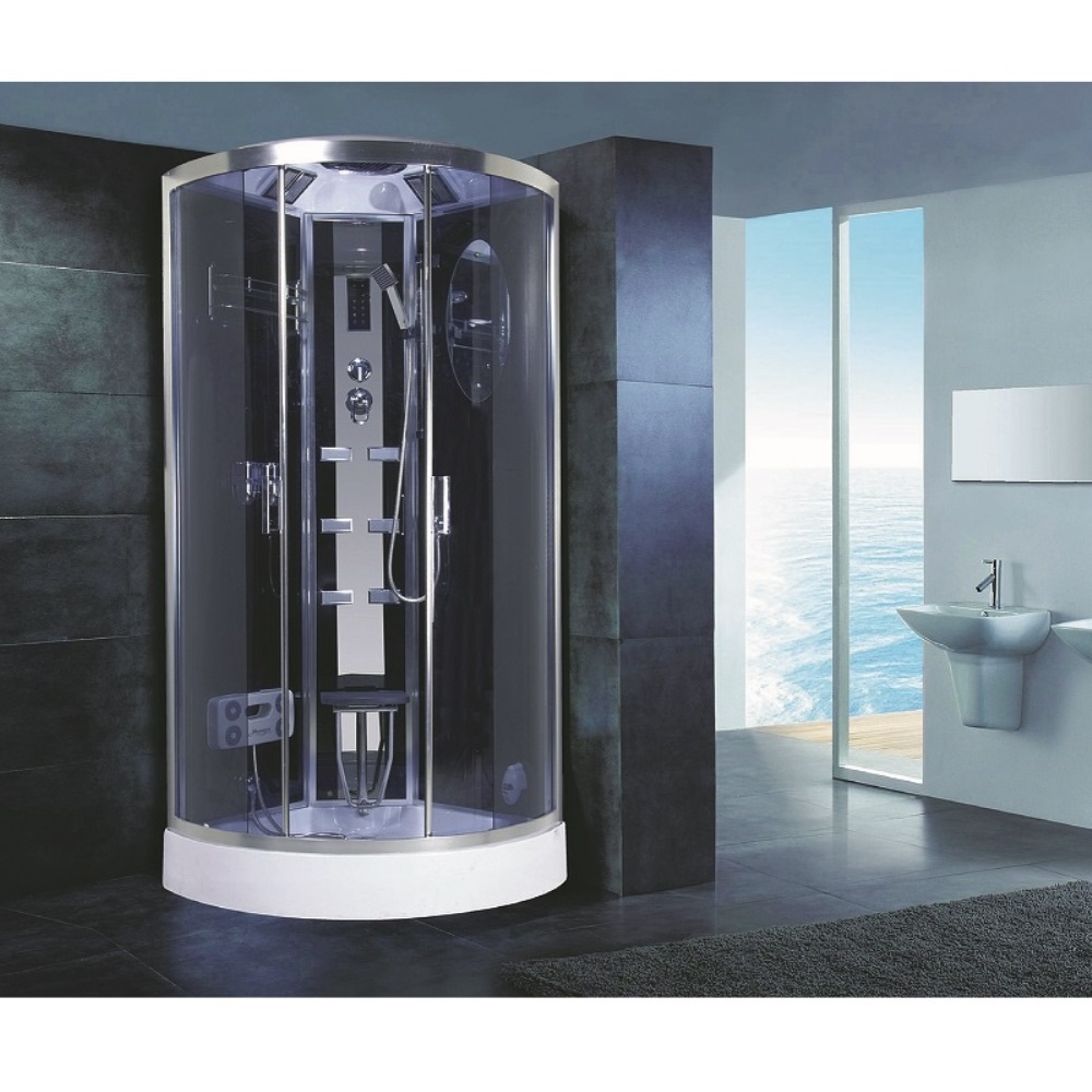 Душевая кабина Niagara Ultra имеет размеры 97х97х220 см. Форма — четверть круга, цвет хром, исполнение полотна двери тонированное. Механизм открывания раздвижной. Поддон низкий.