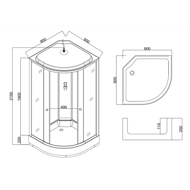 Душевая кабина Taliente TA имеет размеры 90х90х215 см. Форма — четверть круга, профиль хром, исполнение полотна двери тонированное. Механизм открывания раздвижной. Поддон средний.