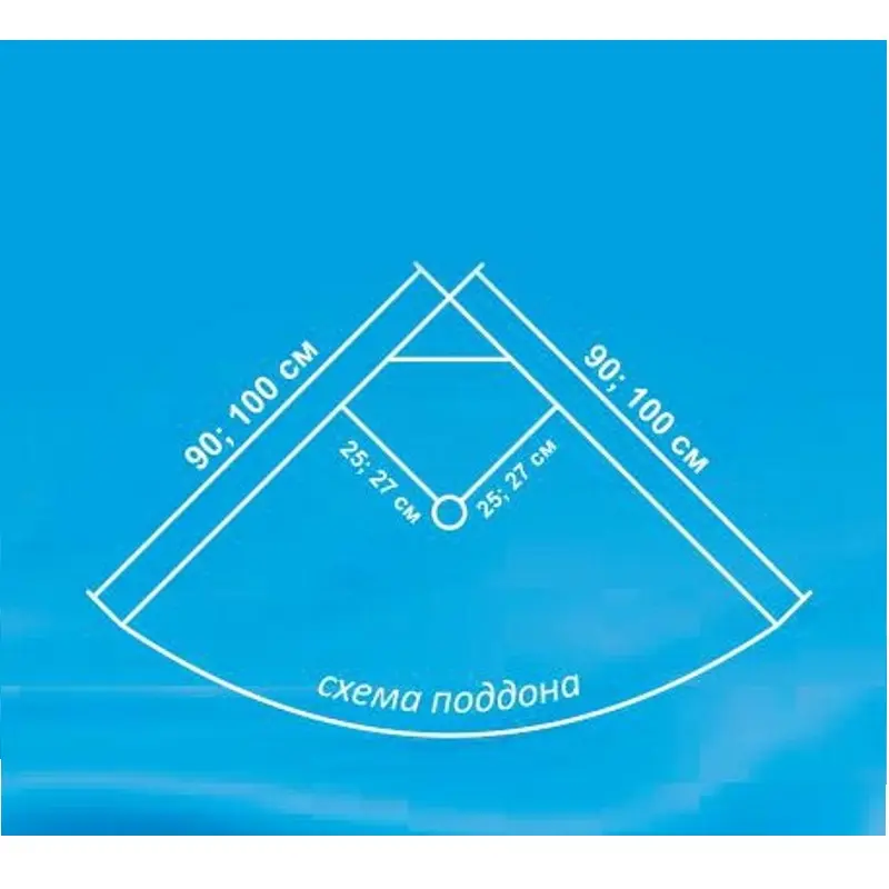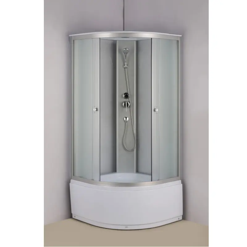 Душевая кабина Водный мир имеет размер 100х100 см. Форма — четверть круга , цвет хром, исполнение полотна двери матовое. Механизм открывания раздвижной.