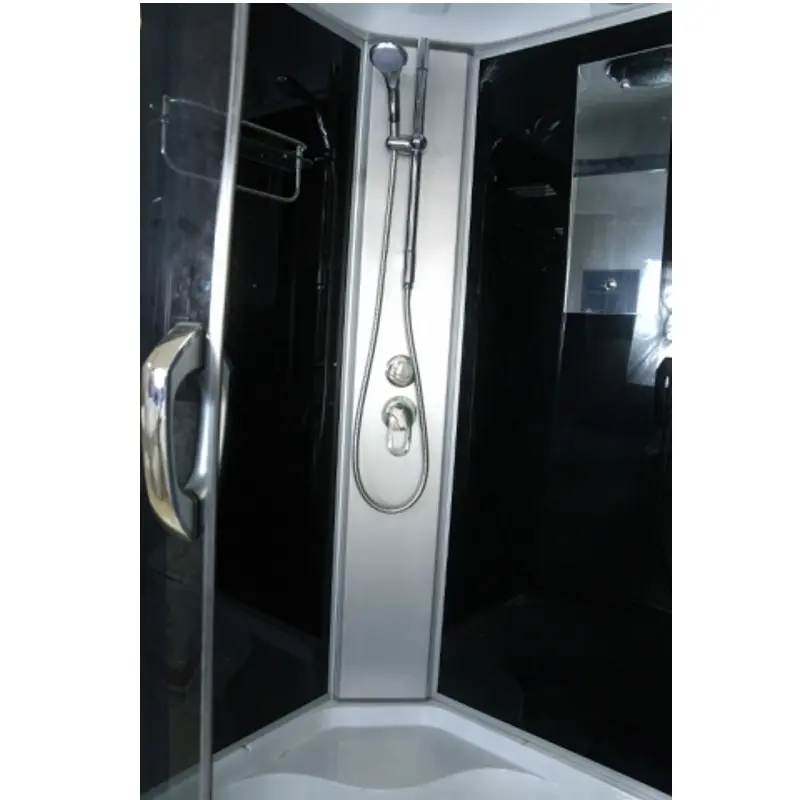 Душевая кабина Водный мир имеет размер 100х100 см. Форма — четверть круга , цвет хром, исполнение полотна двери тонированное. Механизм открывания раздвижной.
