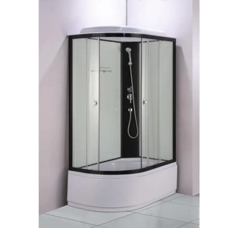 Душевая кабина Водный мир правая имеет размер 120х80 см. Форма — асимметричная , цвет черный, исполнение полотна двери прозрачное. Механизм открывания раздвижной.