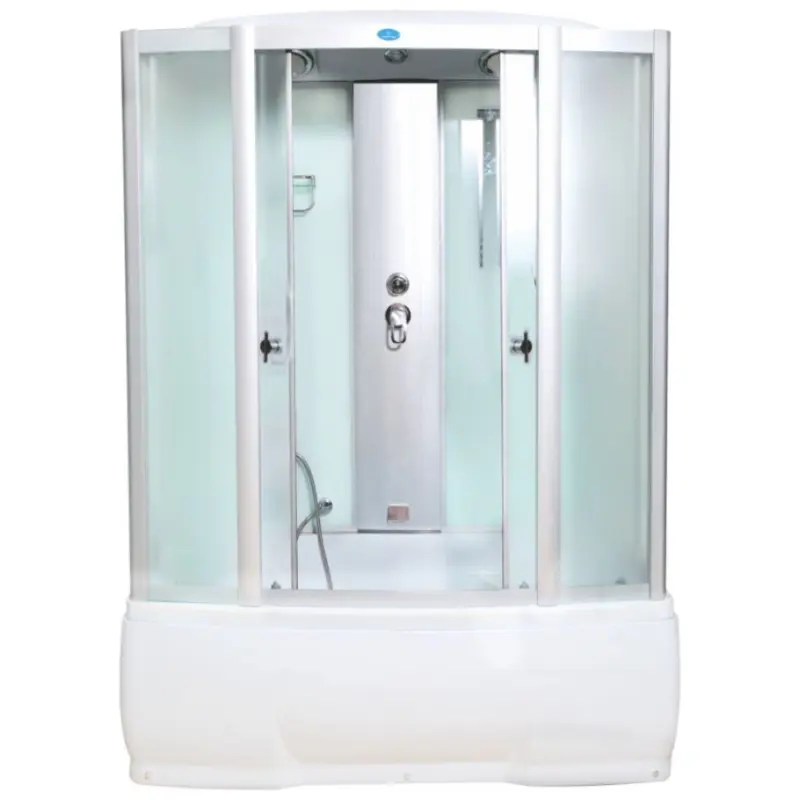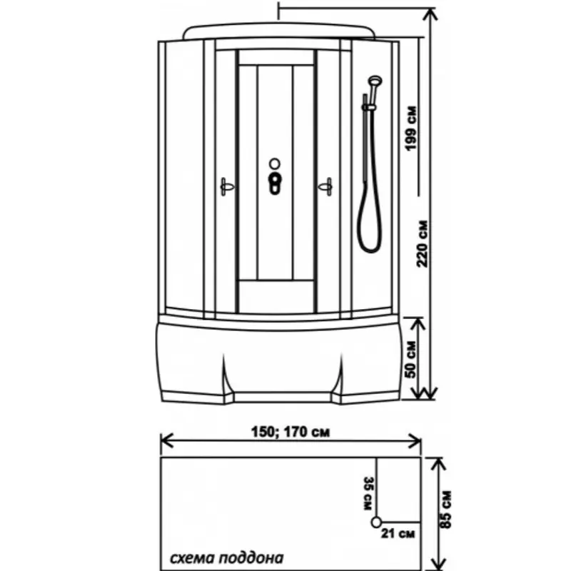 Душевая кабина Водный мир имеет размер 170х85 см. Форма — прямоугольная , цвет хром, исполнение полотна двери матовое. Механизм открывания раздвижной.