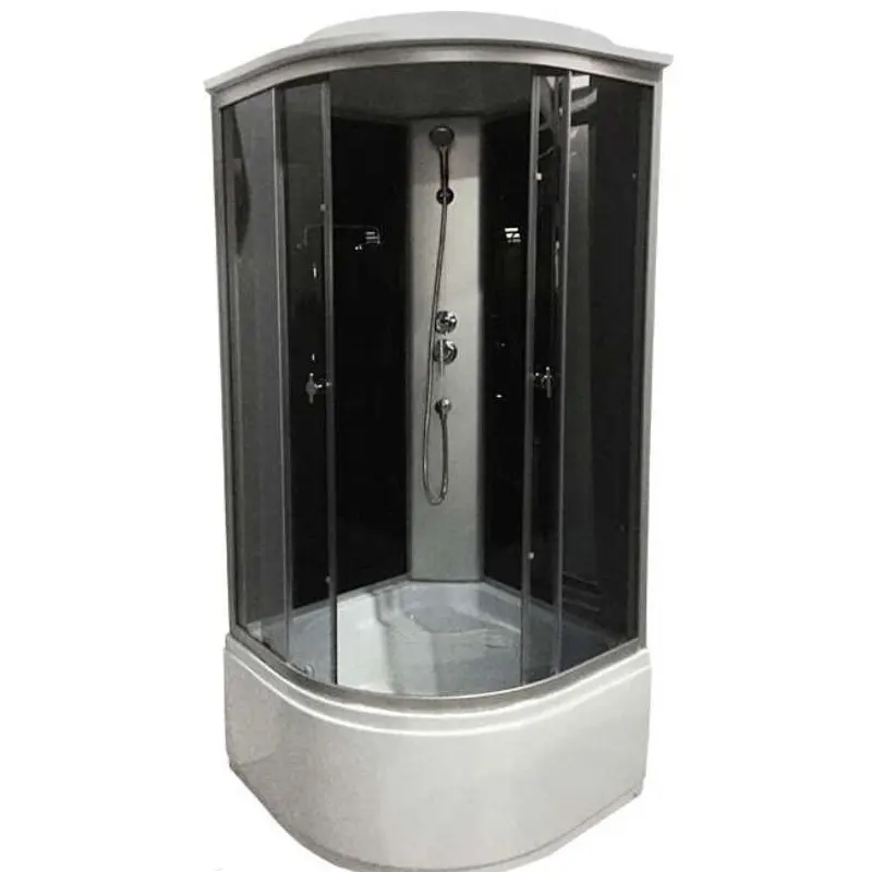 Душевая кабина Водный мир имеет размер 80х80 см. Форма — четверть круга , цвет хром, исполнение полотна двери тонированное. Механизм открывания раздвижной.