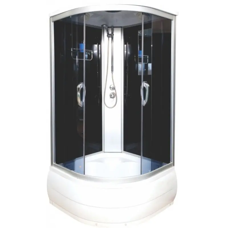 Душевая кабина Водный мир имеет размер 80х80 см. Форма — четверть круга , цвет хром, исполнение полотна двери тонированное. Механизм открывания раздвижной.