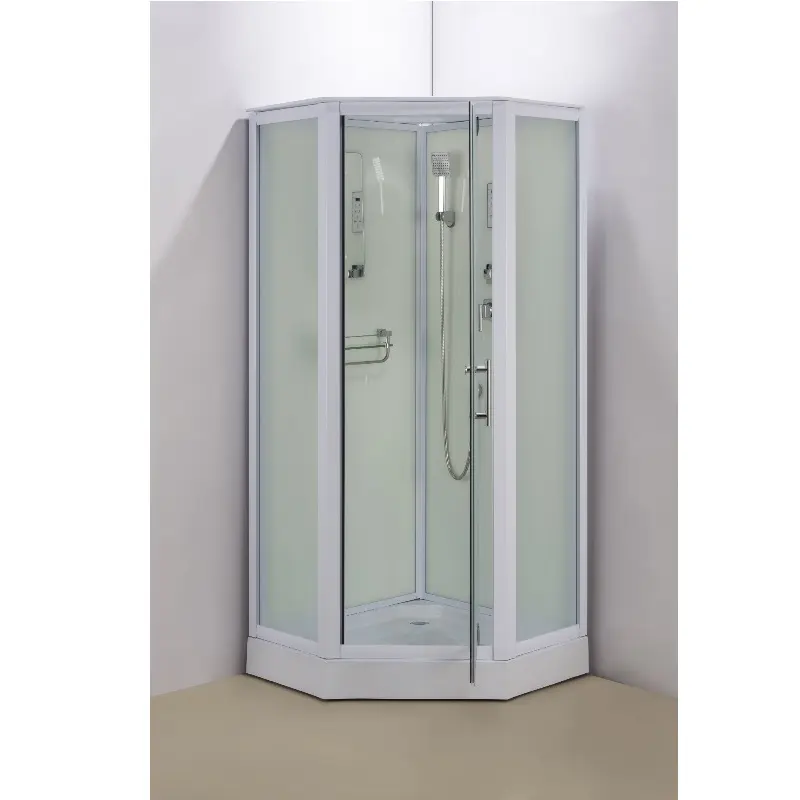 Душевая кабина Водный мир имеет размер 90х90 см. Форма — пятиугольная , цвет белый, исполнение полотна двери матовое. Механизм открывания распашной.
