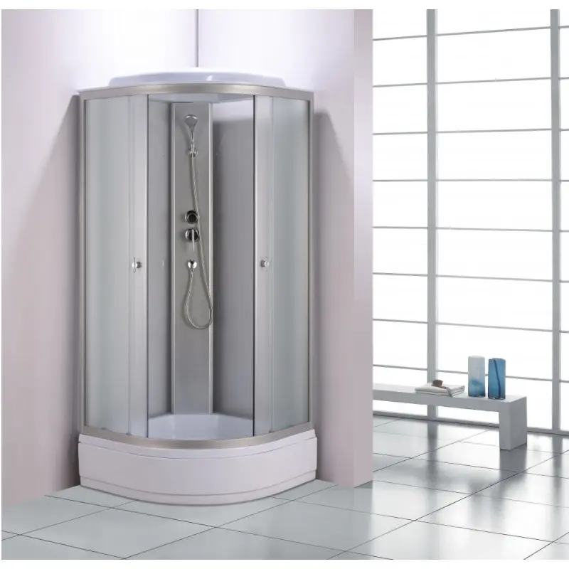 Душевая кабина Водный мир имеет размер 90х90 см. Форма — четверть круга , цвет хром, исполнение полотна двери матовое. Механизм открывания раздвижной.