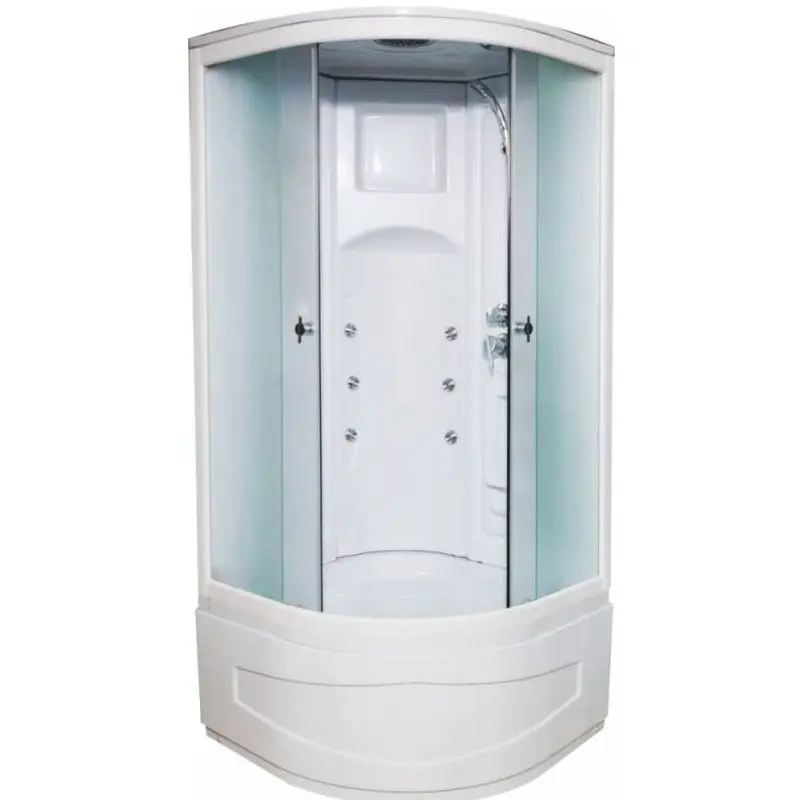 Душевая кабина Водный мир имеет размер 90х90 см. Форма — четверть круга , цвет хром, исполнение полотна двери матовое, задние стенки акриловые. Механизм открывания раздвижной.