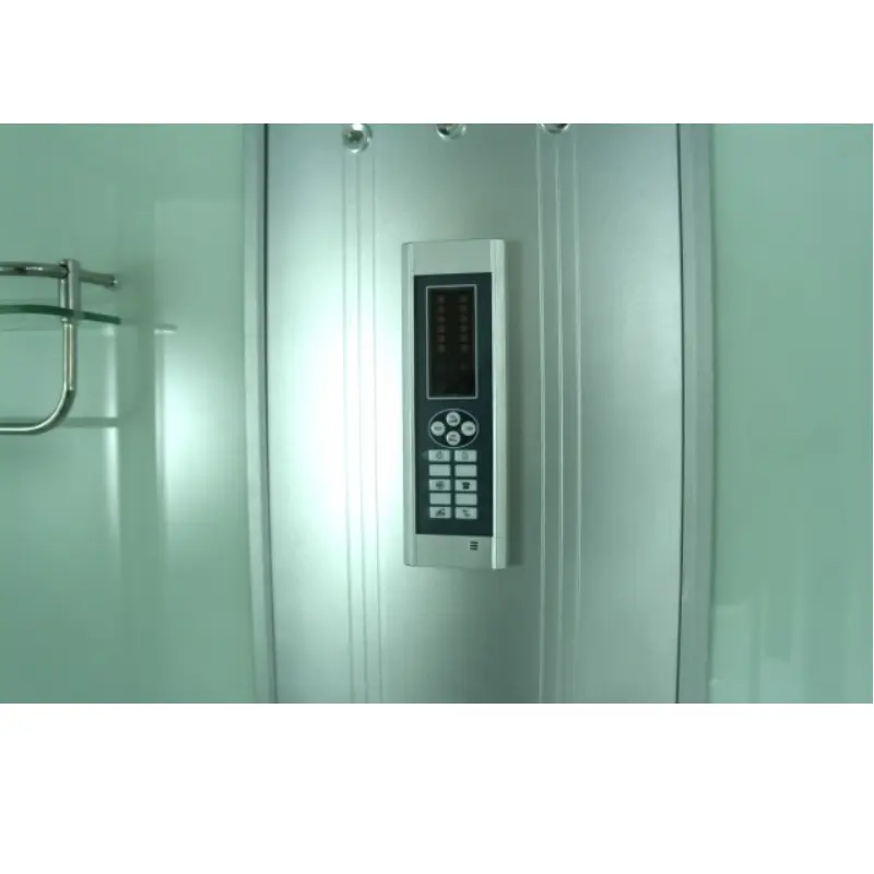 Душевая кабина Водный мир имеет размер 90х90 см. Форма — четверть круга , цвет хром, исполнение полотна двери тонированное. Механизм открывания раздвижной.