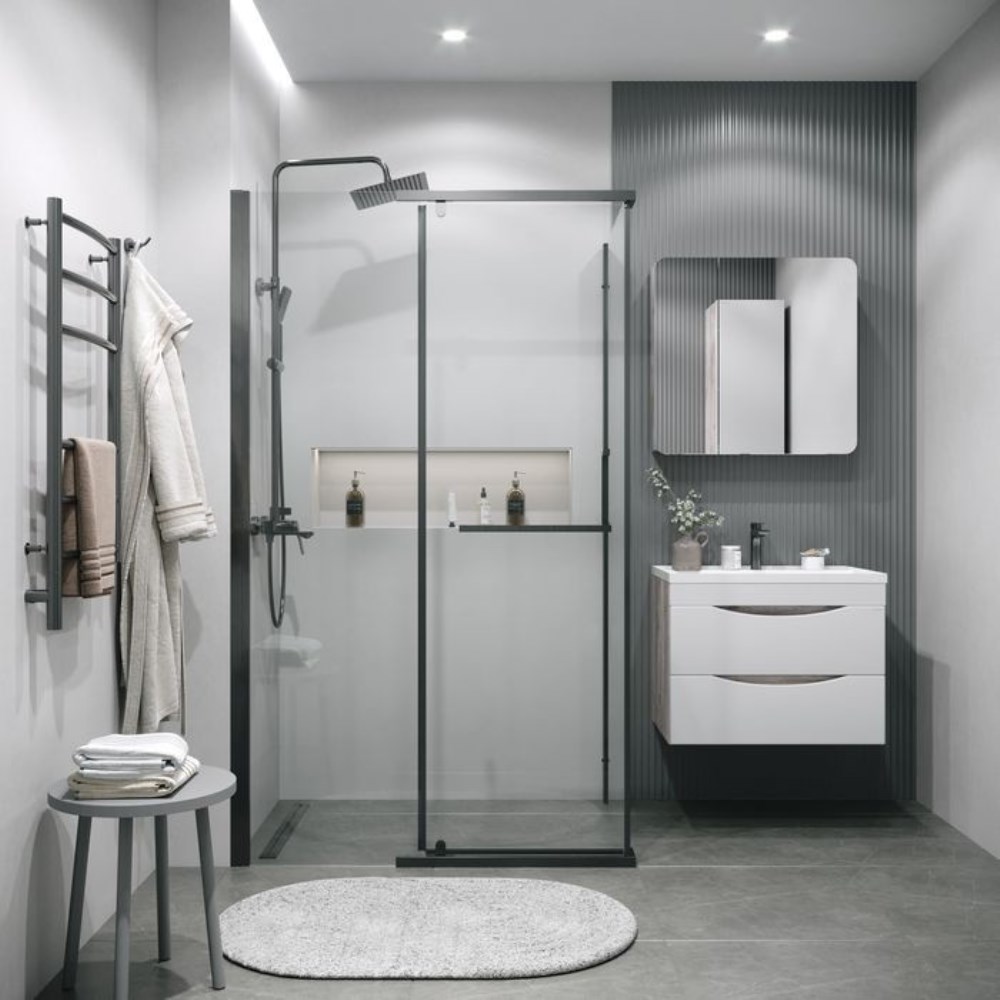 Душевая стенка Grossman Pragma имеет размер 100х195 см. Прямоугольная форма, цвет профиля — графит, исполнение полотна двери — прозрачное. Конструкция состоит из 1 неподвижной секции. Устанавливается в облицованный кафелем угол или нишу ванной комнаты на поддон или на пол с душевыми дверями