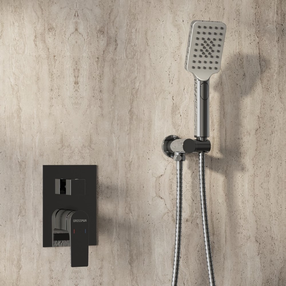 Душевая встройка Grossman Classic идеальное дополнение душевой зоны. Система изготовлена из качественных материалов и имеет защитное покрытие, что обеспечивает прочность и надежность изделия. Комплектация: смеситель, излив, лейка ручного и тропического душа.