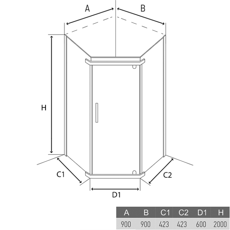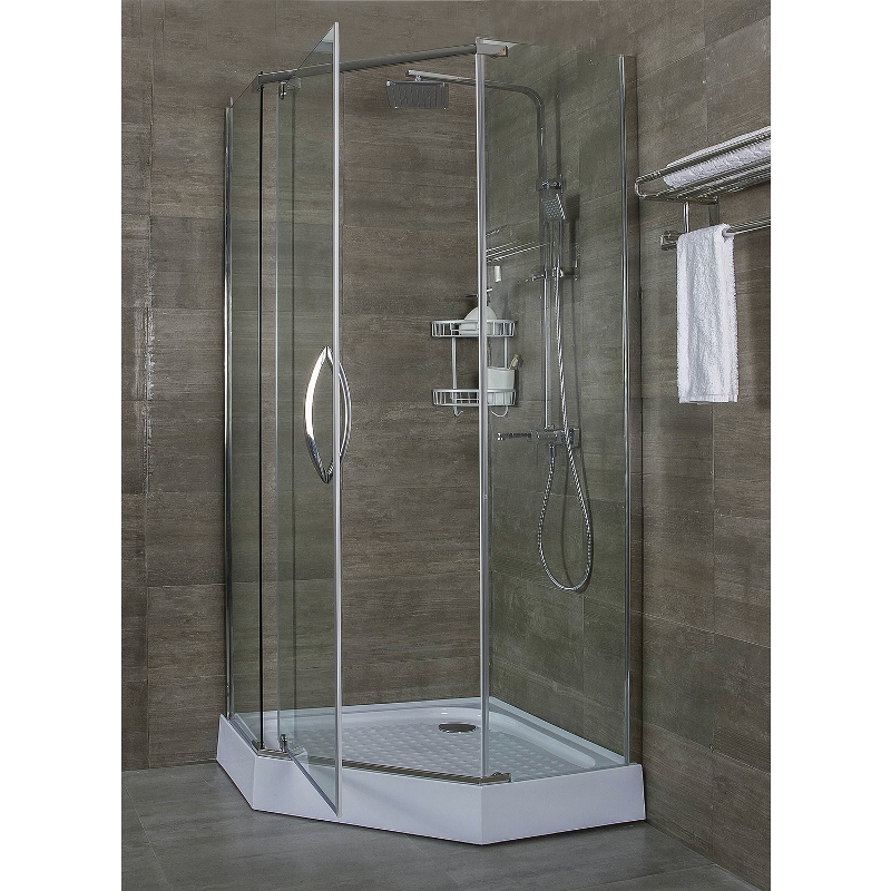 Душевой уголок Alex Baitler AB215 имеет размер 90х90 см. Пятиугольная форма, цвет профиля — хром, исполнение полотна двери — прозрачное. Конструкция состоит из 3 секций: 2 неподвижных и распашной. Устанавливается в облицованный кафелем угол ванной комнаты на поддон.