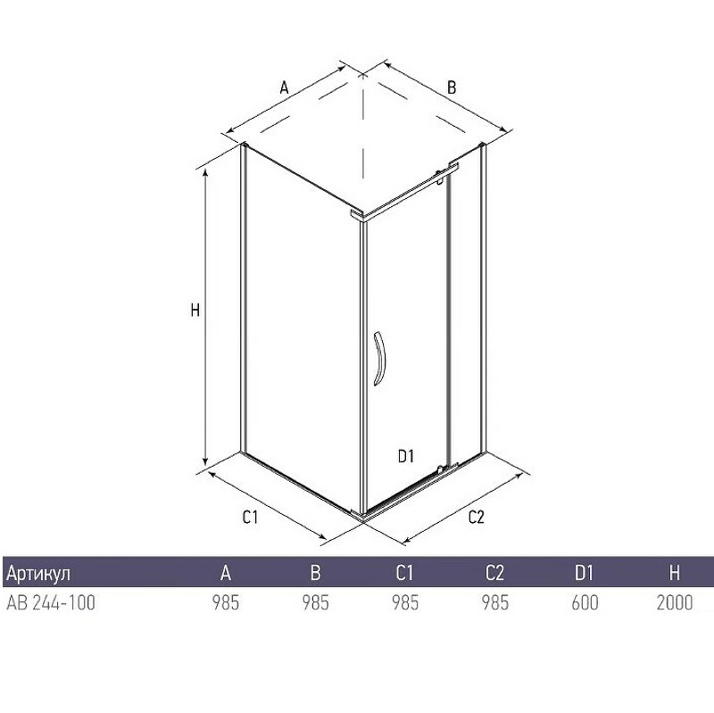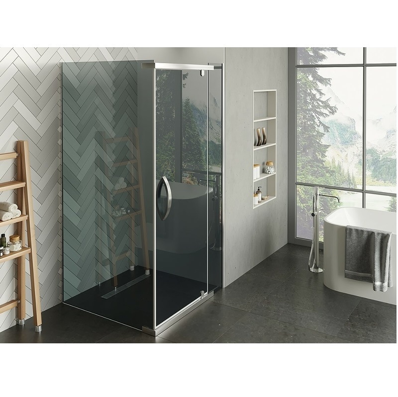 Душевой уголок Alex Baitler AB244 имеет размер 100х100 см. Квадратная форма, цвет профиля — хром, исполнение полотна двери — тонированное. Конструкция состоит из 3 секций: 2 неподвижных и распашной. Устанавливается в облицованный кафелем угол ванной комнаты на поддон.