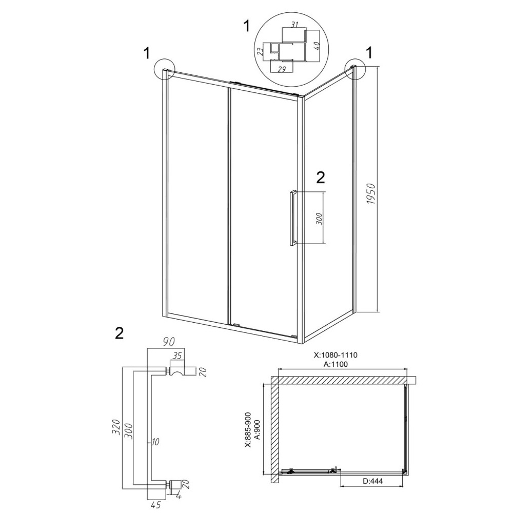Душевой уголок Grossman Cosmo имеет размер 110х90х195 см. Прямоугольная форма, цвет профиля — хром, исполнение полотна двери — прозрачное. Конструкция состоит из 3 секций. Раздвижной механизм открывания. Устанавливается в облицованный кафелем угол ванной комнаты на поддон.
