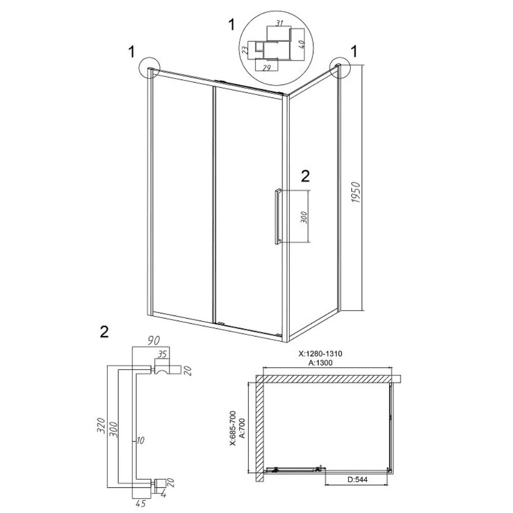 Душевой уголок Grossman Cosmo имеет размер 130х70х195 см. Прямоугольная форма, цвет профиля — хром, исполнение полотна двери — рифленое. Конструкция состоит из 3 секций. Раздвижная механизм открывания. Устанавливается в облицованный кафелем угол ванной комнаты на поддон.