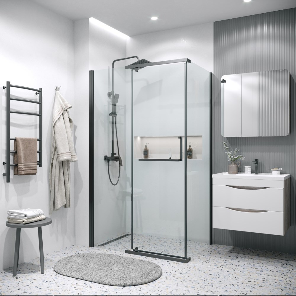 Душевой уголок Grossman Pragma имеет размер 110х100х195 см. Прямоугольная форма, цвет профиля — черный, исполнение полотна двери — прозразное. Конструкция состоит из 3 секций. Распашная механизм открывания. Устанавливается в облицованный кафелем угол ванной комнаты на поддон.