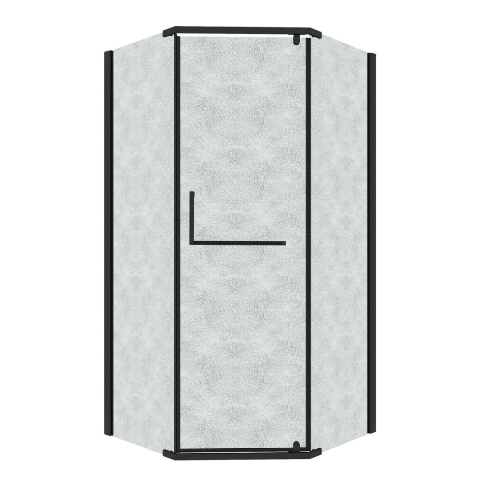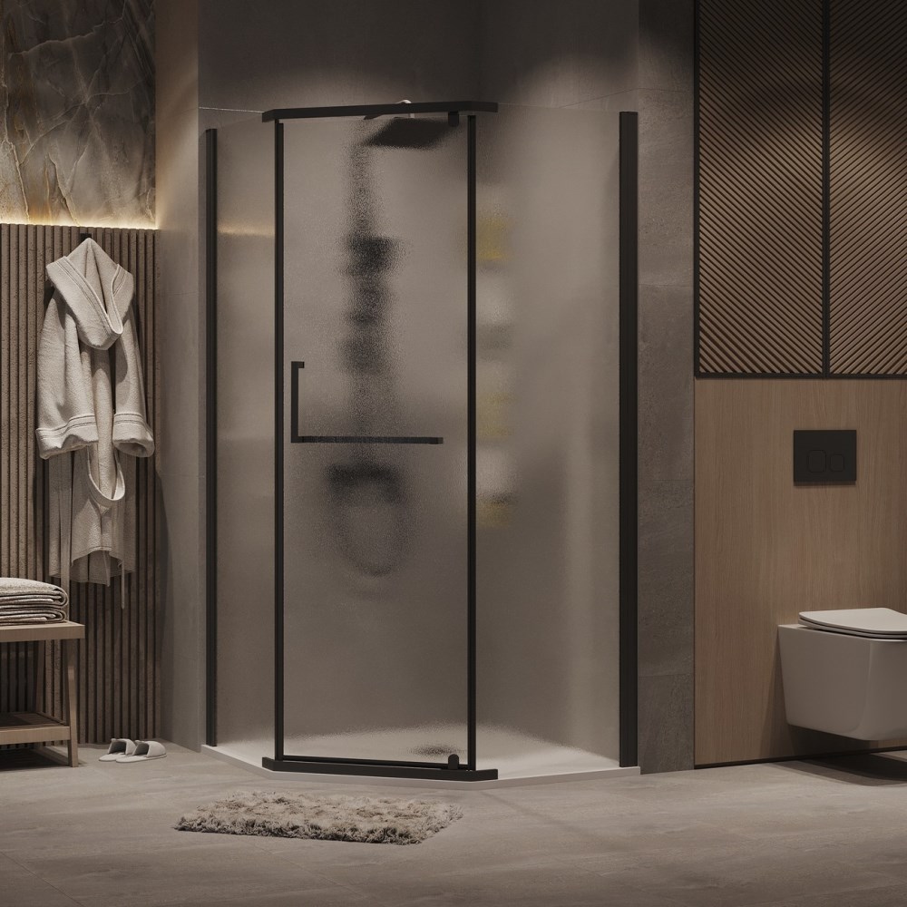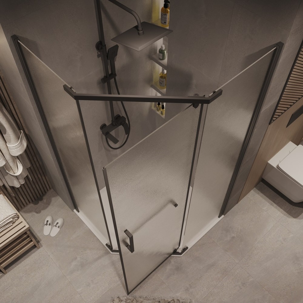 Душевой уголок Grossman Pragma имеет размер 90х90х195 см. Пятиугольная форма, цвет профиля — черный, исполнение полотна двери — рифленое. Конструкция состоит из 3 секций. Распашная механизм открывания. Устанавливается в облицованный кафелем угол ванной комнаты на поддон.