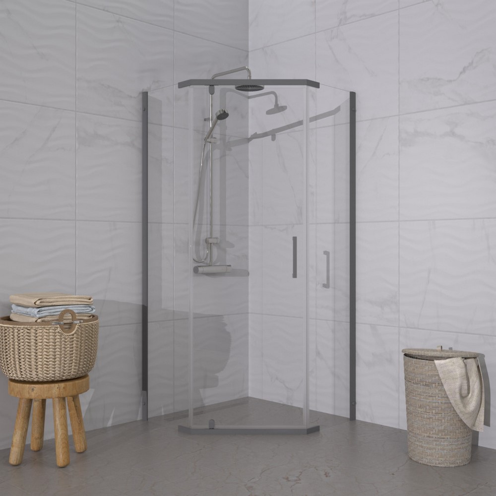 Душевой уголок Triton Дека имеет размер 100х100х190 см. Форма — пятиугольная, цвет профиля — графит, исполнение полотна двери — прозрачное. Конструкция состоит из 3 секций. Распашной механизм открывания. Устанавливается в облицованный кафелем угол ванной комнаты на поддон.