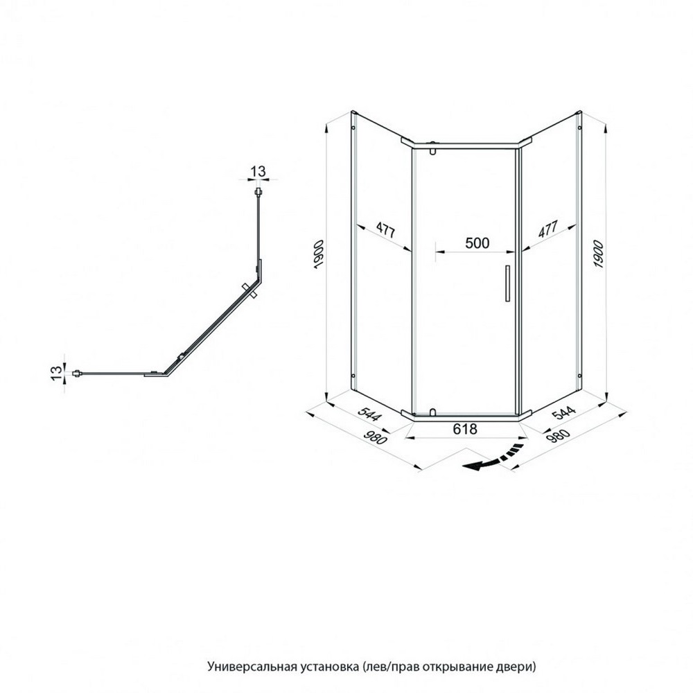 Душевой уголок Triton Дека имеет размер 100х100х190 см. Форма — Пятиугольная, цвет профиля — графит, исполнение полотна двери — прозрачное. Конструкция состоит из 3 секций. Распашной механизм открывания. Устанавливается в облицованный кафелем угол ванной комнаты на поддон.