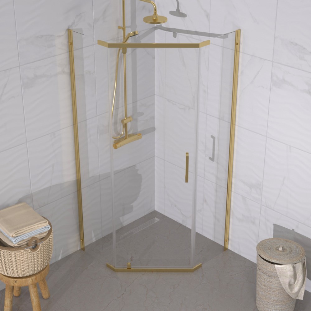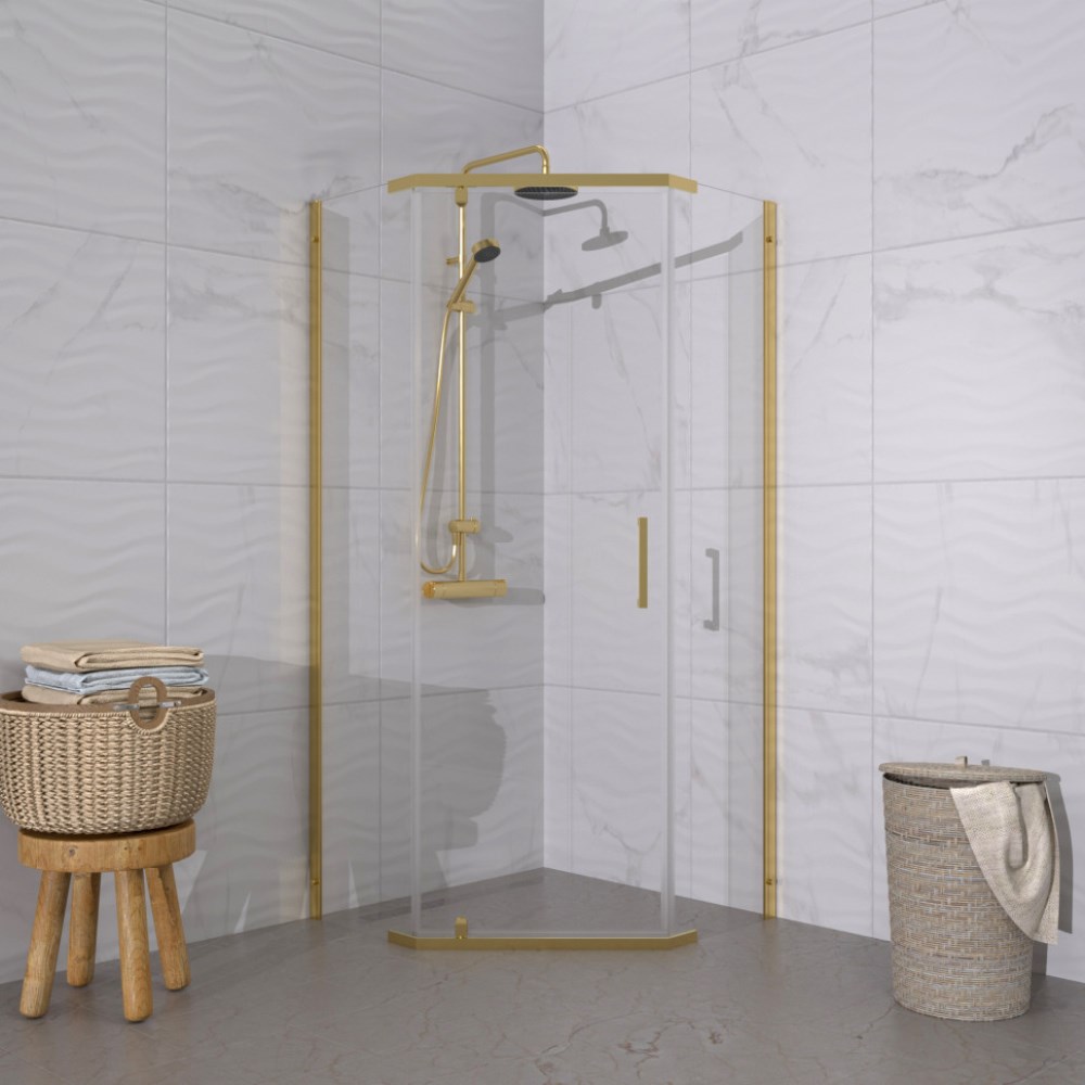 Душевой уголок Triton Дека имеет размер 100х100см. Форма — пятиугольная, цвет профиля — золотой, исполнение полотна двери — прозрачное. Конструкция состоит из 3 секций: 2 неподвижных и 1 распашная. Устанавливается в облицованный кафелем угол ванной комнаты на поддон.