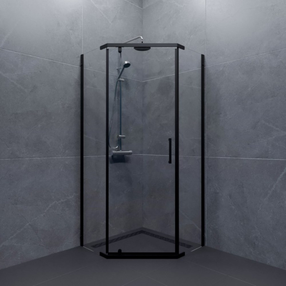 Душевой уголок Triton Дека имеет размер 88х88 см. Форма — пятиугольная, цвет профиля — черный, исполнение полотна двери — прозрачное. Конструкция состоит из 3 секций. Распашная механизм открывания. Устанавливается в облицованный кафелем угол ванной комнаты на поддон или на пол.