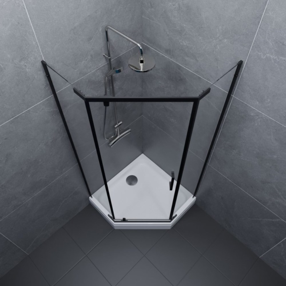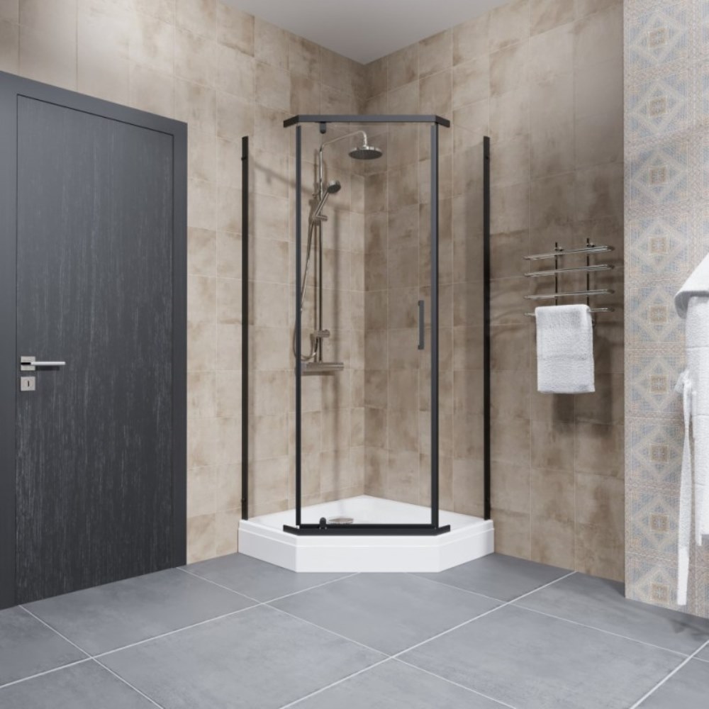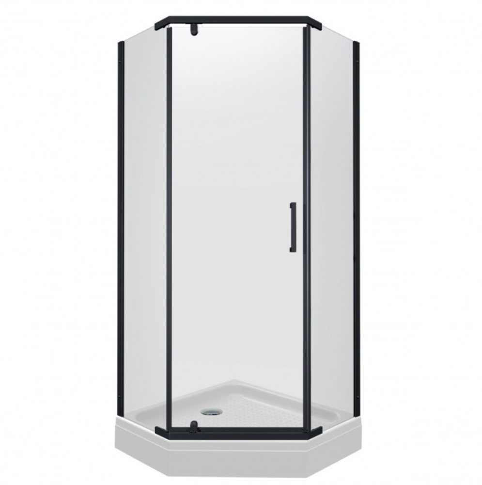Душевой уголок Triton Дека имеет размер 90х90 см. Форма — пятиугольная, цвет профиля — черный, исполнение полотна двери — прозрачное. Конструкция состоит из 3 секций. Распашная механизм открывания. Устанавливается в облицованный кафелем угол ванной комнаты на поддон или на пол.