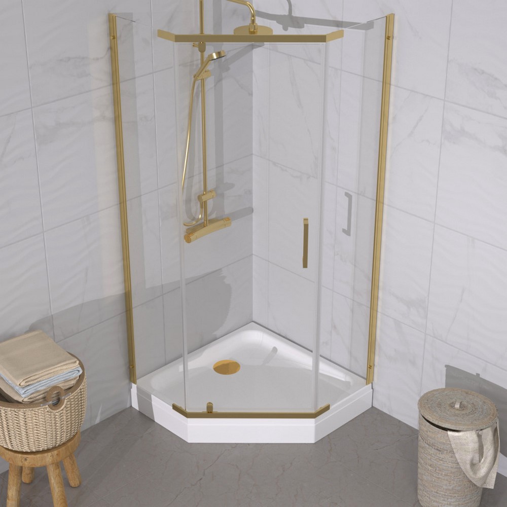 Душевой уголок Triton Дека с поддоном А имеет размер 90х90х207 см. Форма — Пятиугольная, цвет профиля — золото, исполнение полотна двери — прозрачное. Конструкция состоит из 3 секций. Распашной механизм открывания. Устанавливается в облицованный кафелем угол ванной комнаты на поддон.