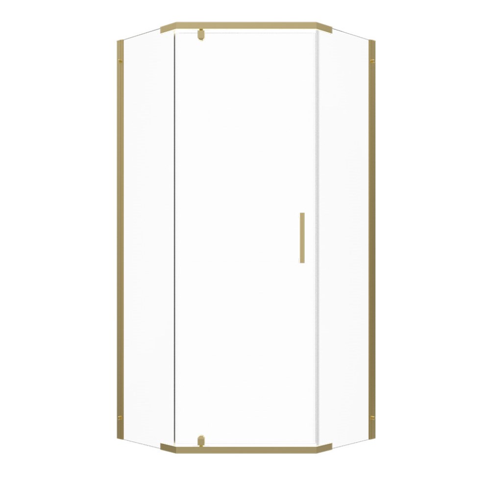 Душевой уголок Triton Дека имеет размер 90х90см. Форма — пятиугольная, цвет профиля — золотой, исполнение полотна двери — прозрачное. Конструкция состоит из 3 секций: 2 неподвижных и 1 распашная. Устанавливается в облицованный кафелем угол ванной комнаты на поддон.