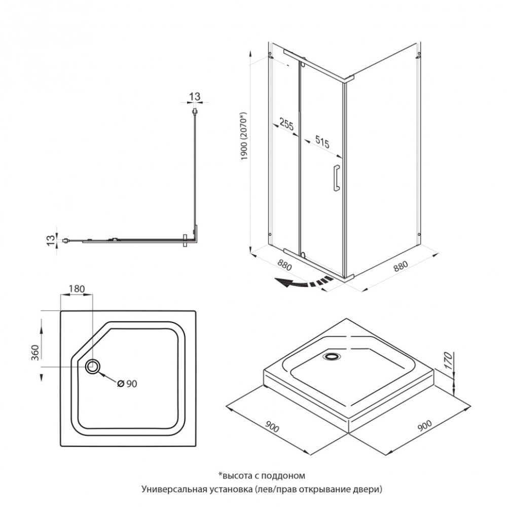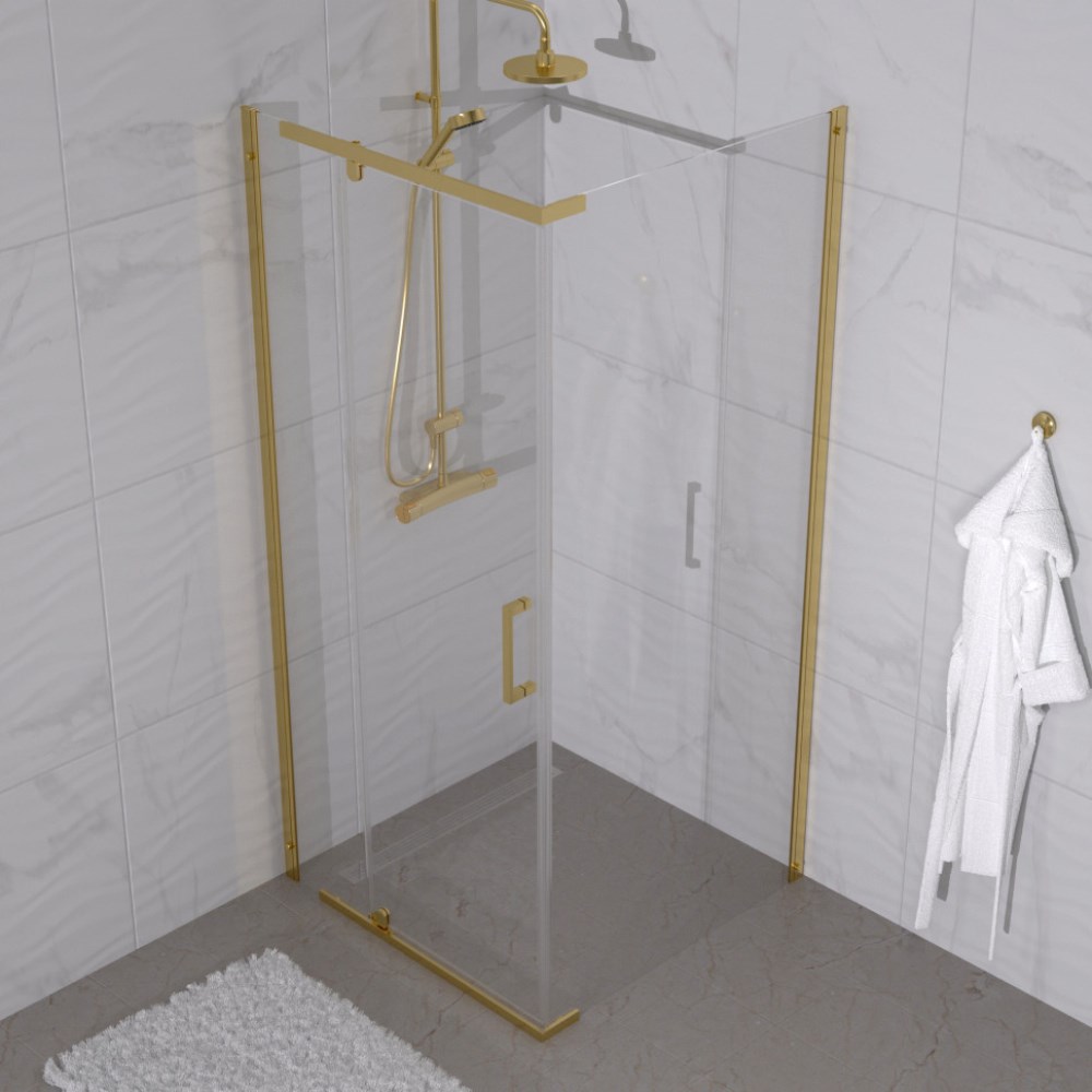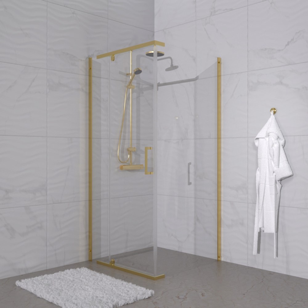 Душевой уголок Triton Терра имеет размер 90х90см. Форма — квадратная, цвет профиля — золотой, исполнение полотна двери — прозрачное. Конструкция состоит из 3 секций: 2 неподвижных и 1 распашная. Устанавливается в облицованный кафелем угол ванной комнаты на поддон.