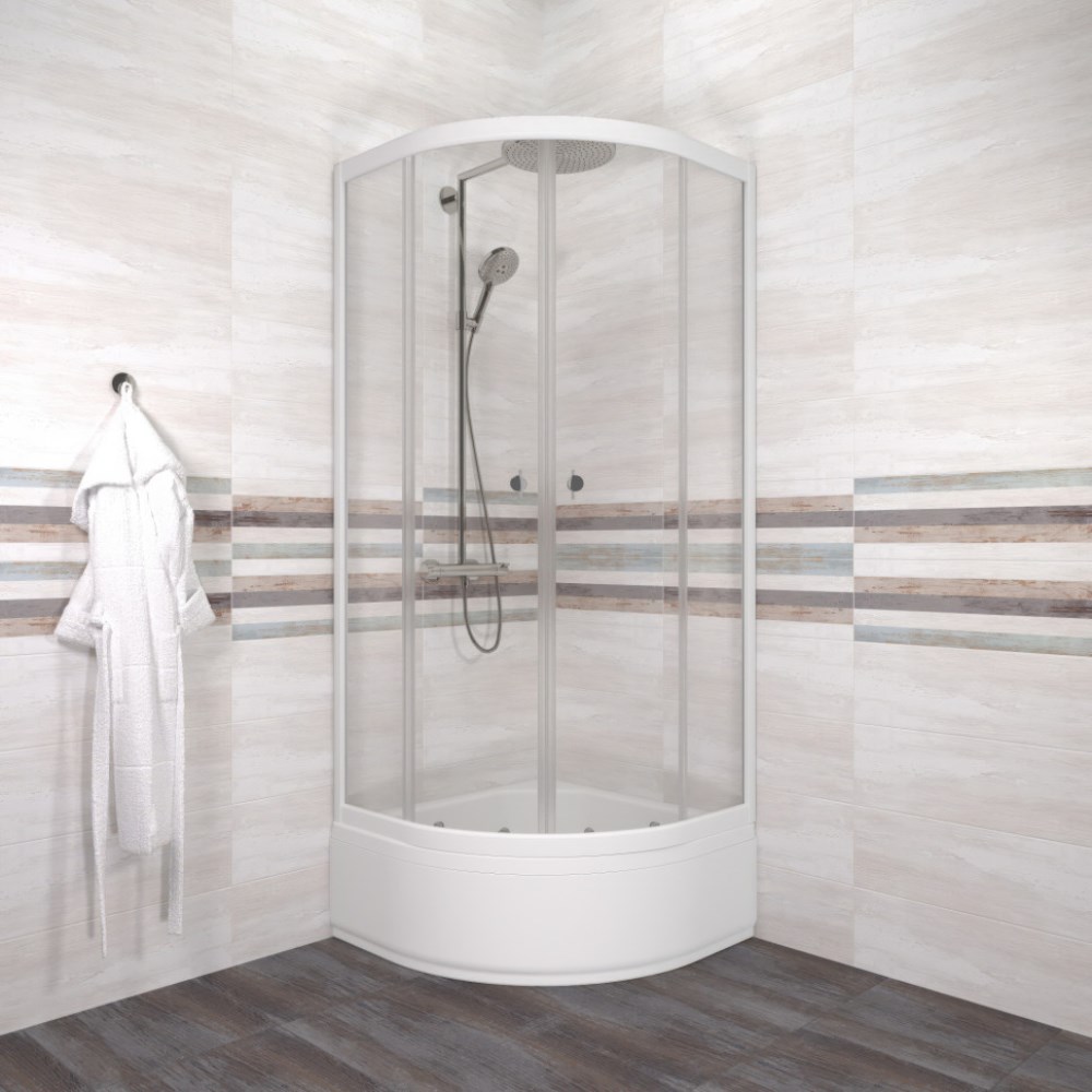 Душевой уголок Triton Ультра имеет размер 80х80х205,5 см. Форма — четверть круга, цвет профиля — белый, исполнение полотна двери — прозрачное. Конструкция состоит из 4 секций. Раздвижная механизм открывания. Устанавливается в облицованный кафелем угол ванной комнаты на поддон.