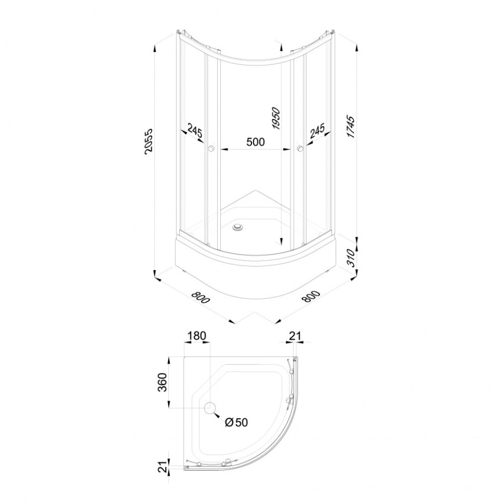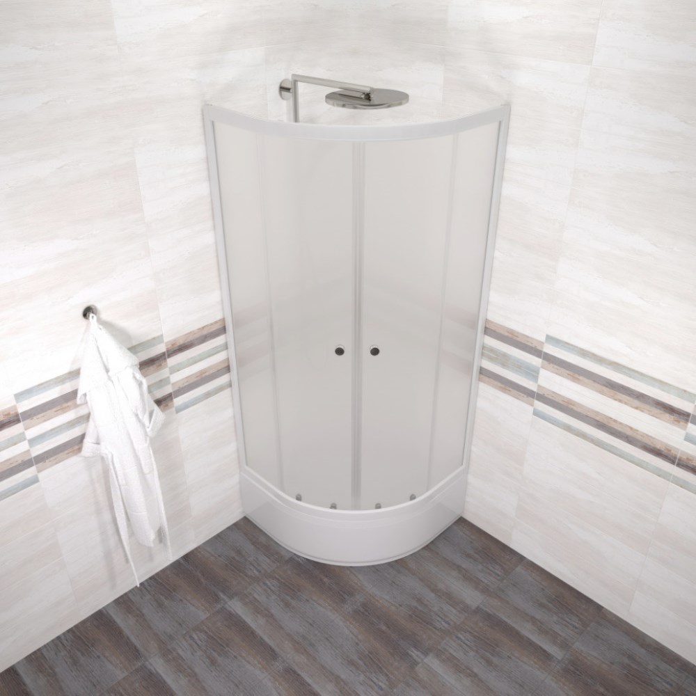 Душевой уголок Triton Вельвет с поддоном В имеет размер 80х80х205,5 см. Форма — четверть круга, цвет профиля — белый, исполнение полотна двери — матовое. Конструкция состоит из 4 секций. Раздвижной механизм открывания. Устанавливается в облицованный кафелем угол ванной комнаты на поддон.