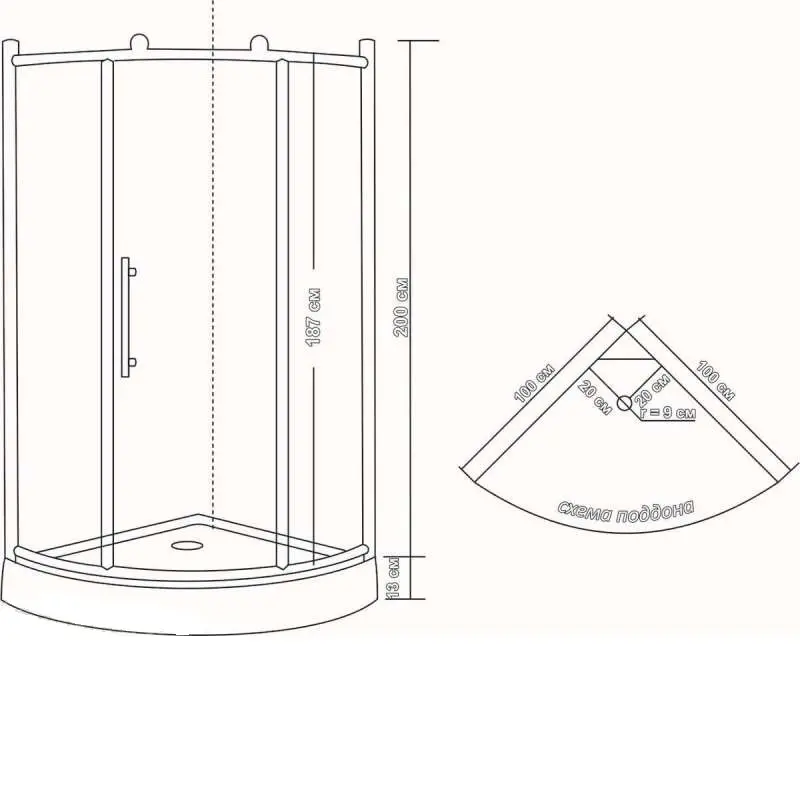 Душевой уголок Водный мир обладает размером 100х100х200 см. Конструкция состоит из трех секций: двух неподвижных и одной раздвижной. Устанавливается в облицованный кафелем угол ванной комнаты на поддон или непосредственно на пол со встроенным душевым каналом или трапом.
