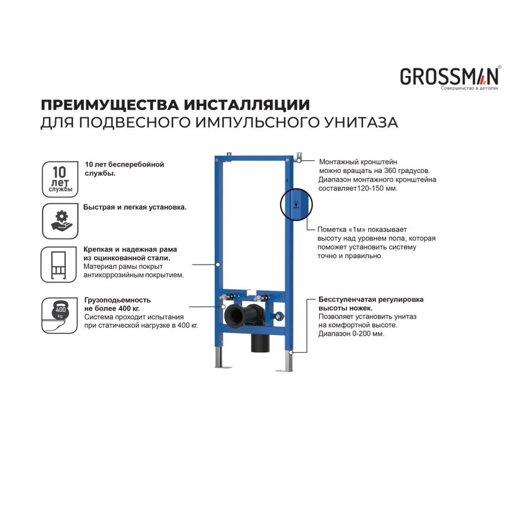 Инсталляция для унитаза Grossman — это система, предназначенная для установки подвесного унитаза с импульсным смывом. Конструкция представляет собой прочную раму.